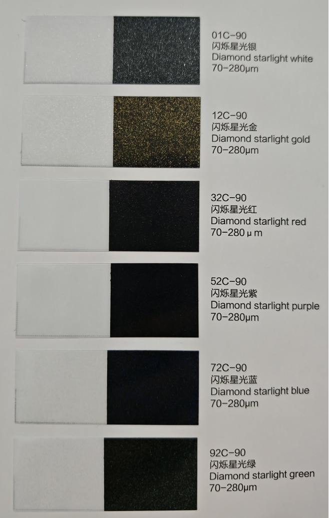The Diamond Series is a special high-gloss pearlescent effect pigment made from a new high-transparent crystalline material based on a metal oxide such as titanium dioxide. Compared with other products, its biggest feature is the high refractive index and the extremely strong flash effect. In particular, the diamond series of products can better reflect the ray, starlight, diamond-like optical dimensions and wonderful color changes.