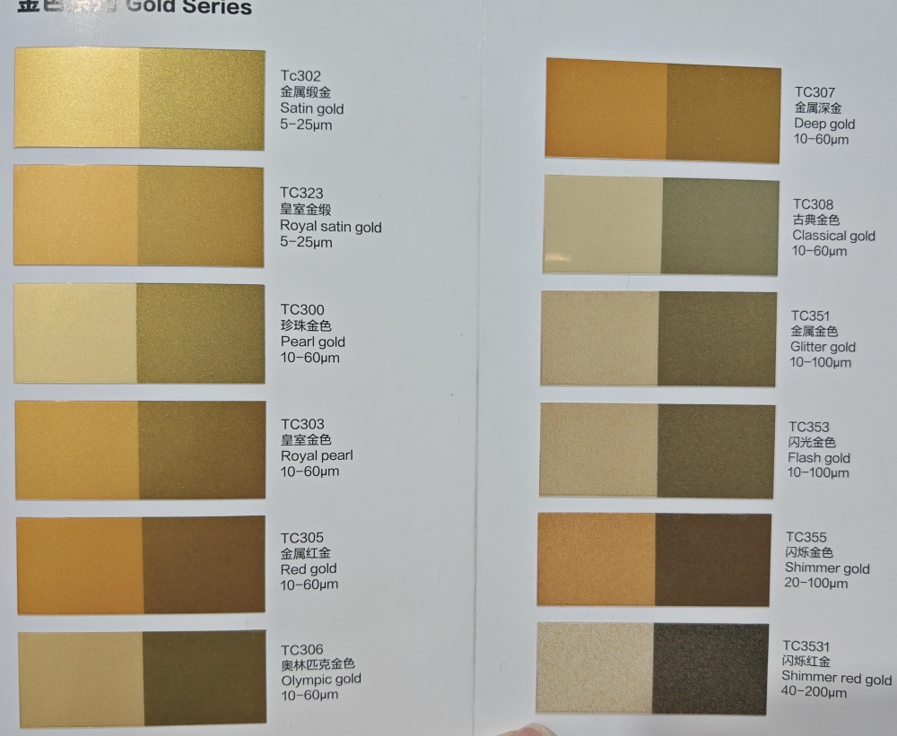 Tuocai Gold Series is coated with titanium dioxide and ferric oxide on the surface of mica. It can produce a golden luster of various hue by precisely controlling the coating ratio of titanium dioxide and ferric oxide. It is non-toxic and tasteless, excellent in high temperature resistance, acid and alkali resistance, light resistance and non-conductivity. It solves the problem of discoloration of traditional copper powder under severe conditions. The gold color of this series is complete,